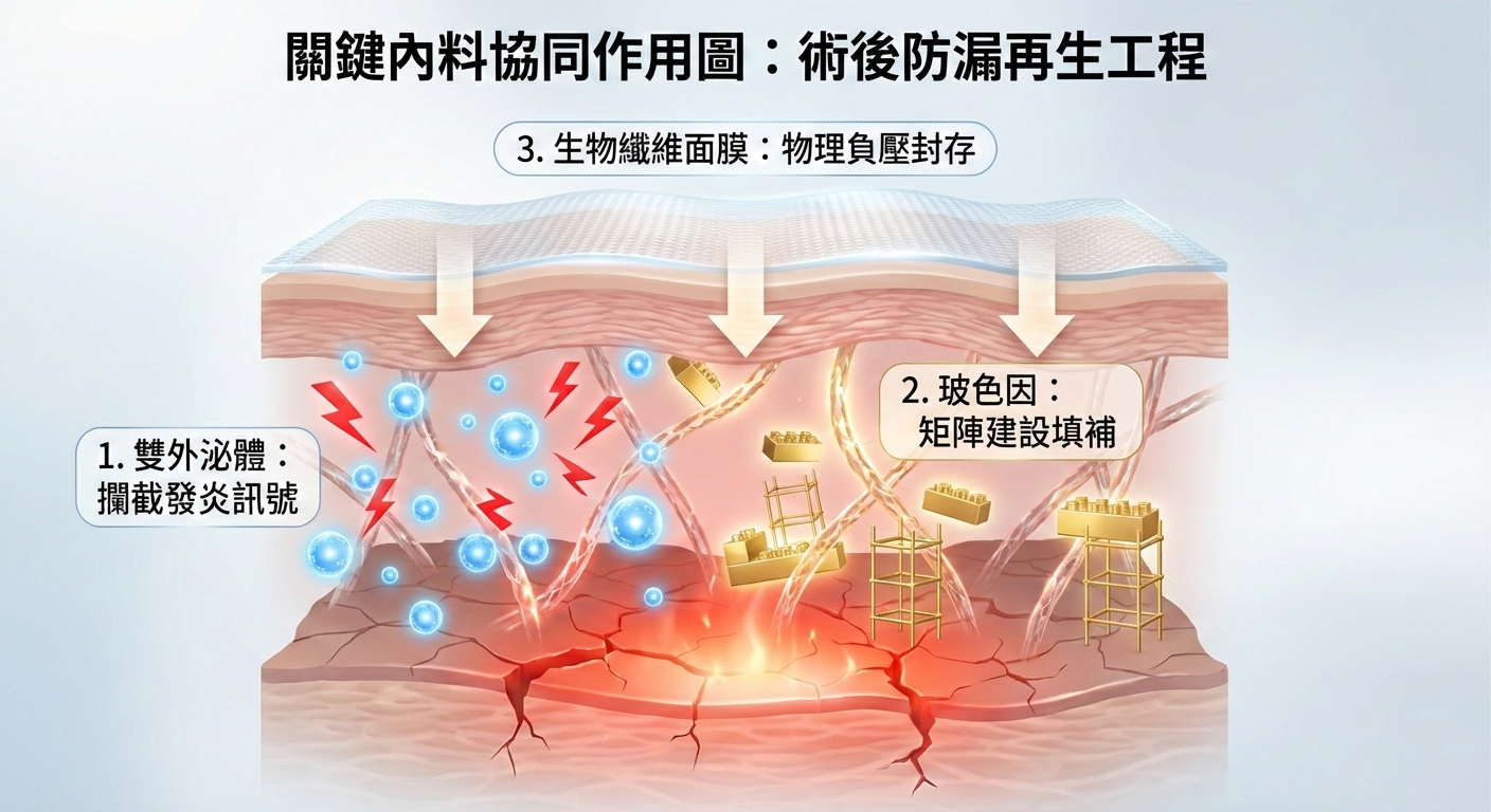 醫美後的微型發炎是漏水的「破洞」,雙外泌體是精準的通訊兵,能主動攔截發炎指令。內料中的高濃度外泌體能安撫術後燥熱,確保能量只用於「建設」而不被發炎「消耗」