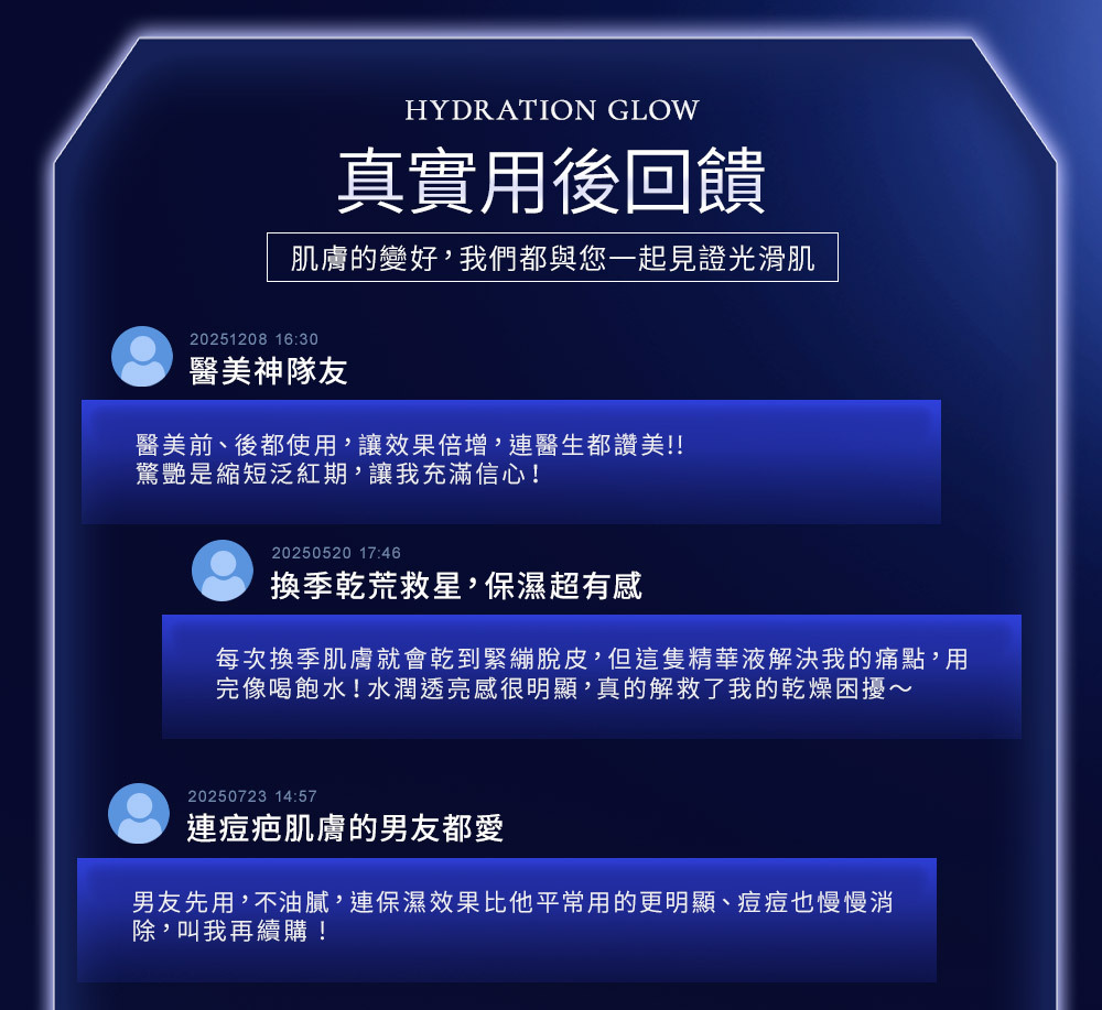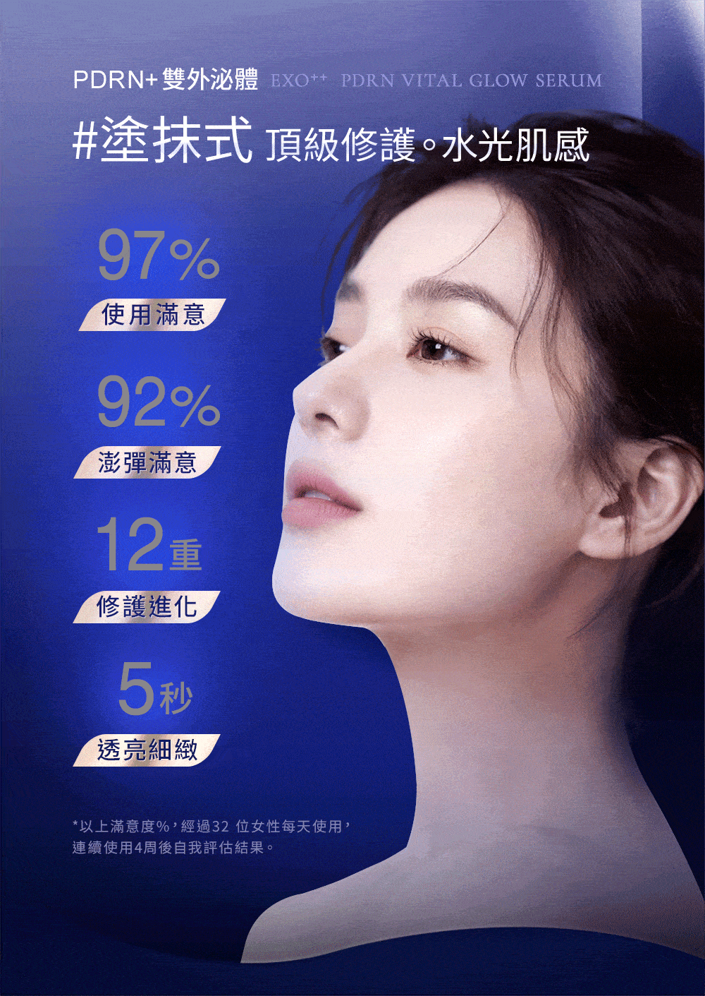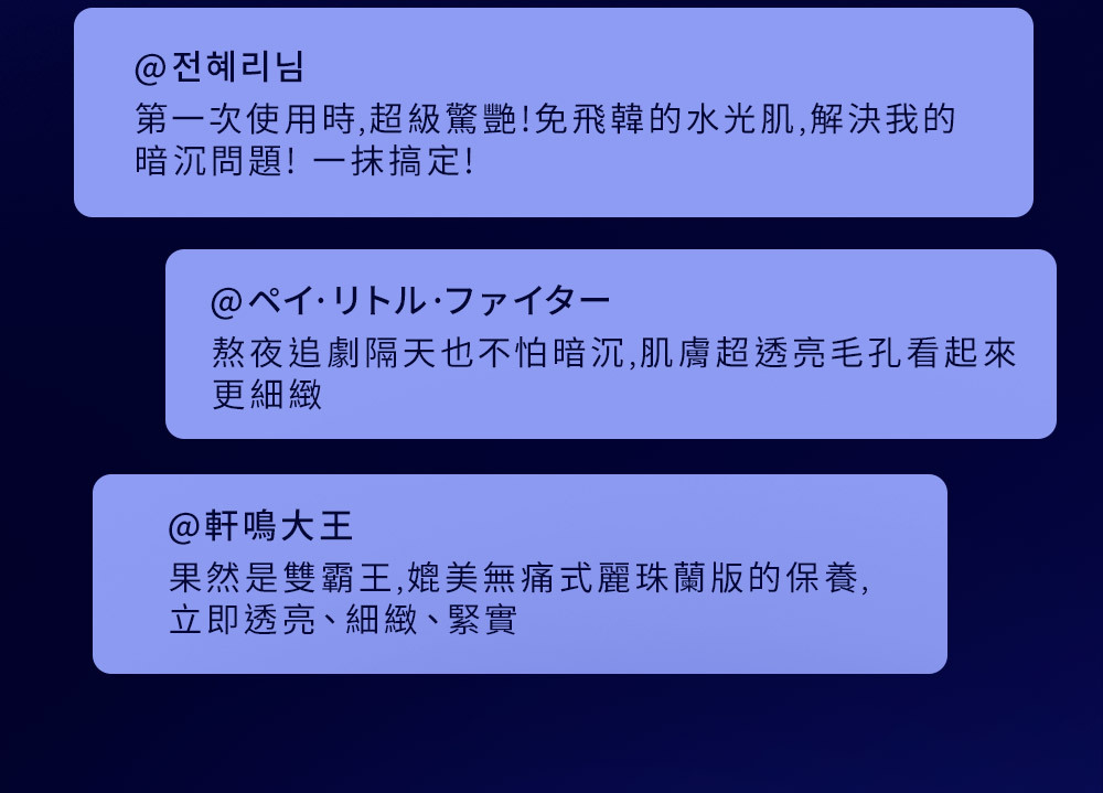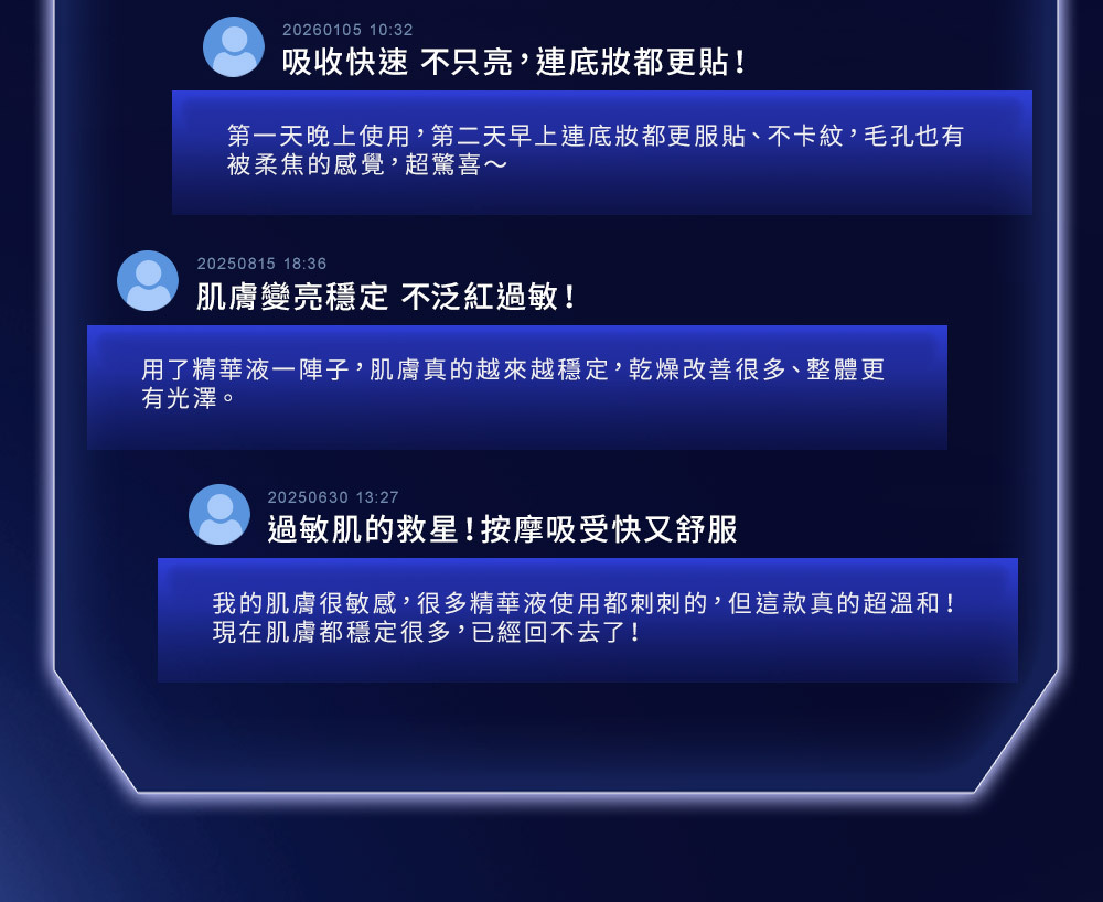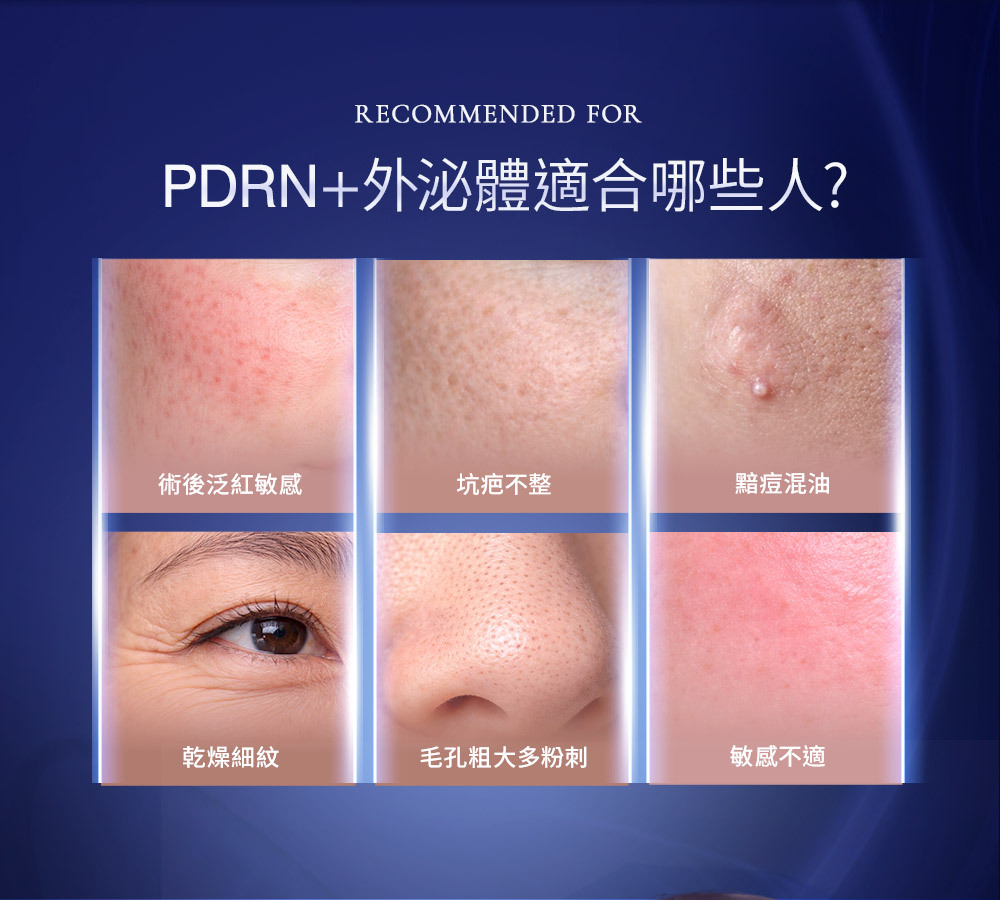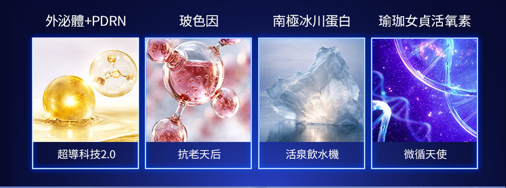 主 成 份: 初乳外泌體、積雪草PDRN、玻色因、山茶花VESICLES、萊茵VESICLES、女貞活氧素等活性成份